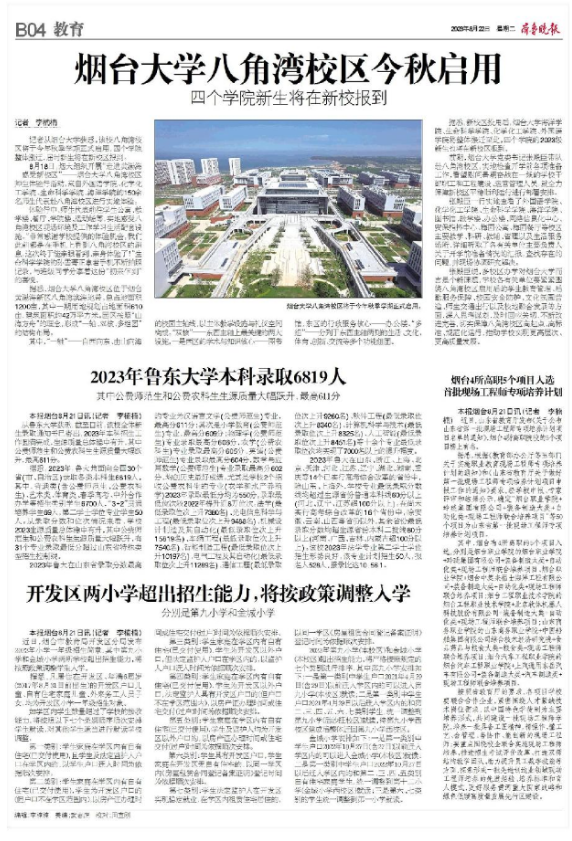 《齊魯晚報》8月22日B04版刊發《煙臺大學八角灣校區今秋啟用 四個學院新生將在新校報到》