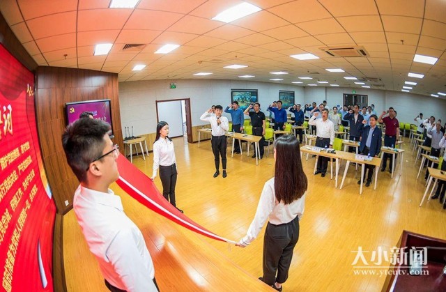 “我志愿加入中國共產黨,擁護黨的綱領,遵守黨的章程,履行黨員義務……”黨課結束后,全體黨員面向黨旗重溫入黨誓詞,錚錚誓言響徹會場。