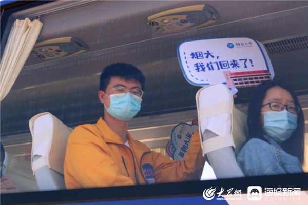 學生在到達各接站點后,會進行體溫檢測、行李消殺,并在輔導員老師的全程陪同下到達煙臺大學東門,此過程為“閉環式”接站,旨在最大程度上保障學生安全。更溫馨的是,每一名返校復學的同學都會獲得一枚印有“面朝大海,迎你歸來”字樣的袖標,這是煙臺大學給予學子的一枚暖心“印記”。
