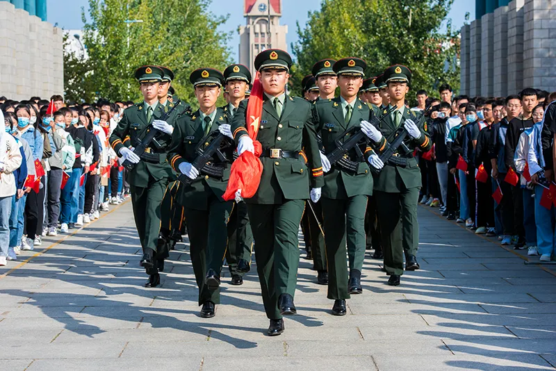 10月1日上午9時,鏗鏘有力的腳步聲在廣場上響起,在場師生屏氣凝神把目光投向國旗護衛隊走來的方向。由30名在校生組成的國旗護衛隊挺拔威武,邁著整齊的步伐,護衛國旗走向升旗臺。伴隨著威武雄壯的《義勇軍進行曲》,鮮紅的五星紅旗冉冉升起,在場師生齊唱國歌,肅立行注目禮,共同感受這一莊重而自豪的時刻。