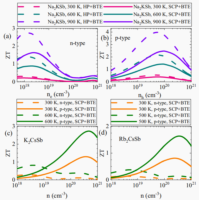 圖:計算的Na2KSb和X2CsSb (X=K,Rb)的熱電品質因數