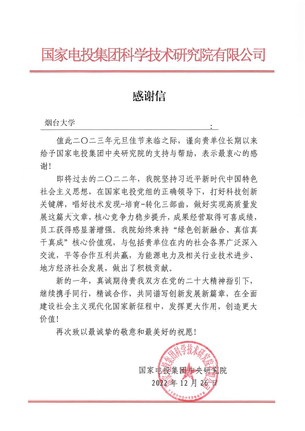 近日,煙臺大學收到了一封來自國家電投集團中央研究院的感謝信。
