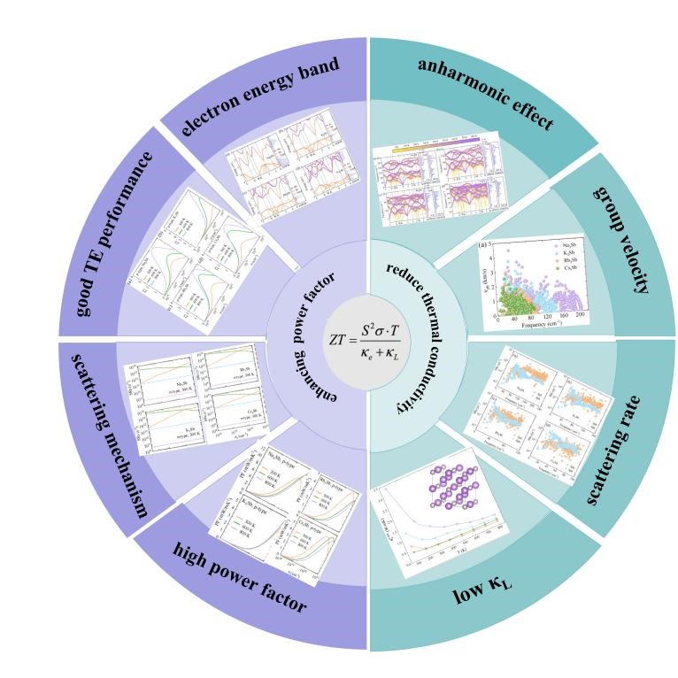 近期,煙臺大學物理與電子信息學院的材料模擬與設計團隊聯合清華大學在堿鏑化合物的熱電性能研究中取得了重要進展。他們采用第一性原理計算結合自洽聲子理論、壓縮感知晶格動力學和玻爾茲曼傳輸方程的先進方案,研究了四種堿鏑化合物的晶格動力學、輸運性質和熱電性能。通過分析聲子頻率的四階非諧重整化以及四聲子散射,詳細探討了這四種材料晶格熱導率背后的微觀機制,揭示了非諧性對熱輸運性質的顯著影響。他們還觀察到一個反常現象:在400 K以上,Rb3Sb的晶格熱導率κL低于Cs3Sb,經過分析發現這主要是因為Rb3Sb的散射速率較大。最后通過考慮各種散射機制,得到了合理的電子弛豫時間和電子輸運性質。由于p型M3Sb在導帶底處具有較大的電子色散帶,因此具有較高的電子遷移率。由于低的晶格熱導率κL和良好的功率因數(PF),這四種p型堿銻化合物表現出優異的熱電性能。