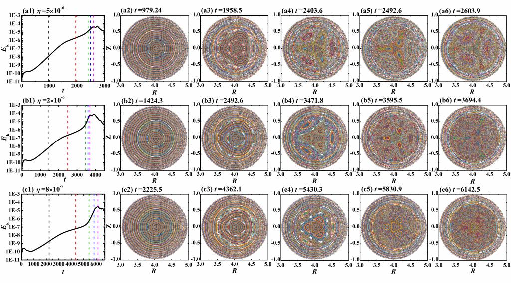 2有理面間距為0.36時,高(a)、中(b)、低(c)三種電阻條件下,等離子體動能的時間演化圖及相應的龐加萊圖。