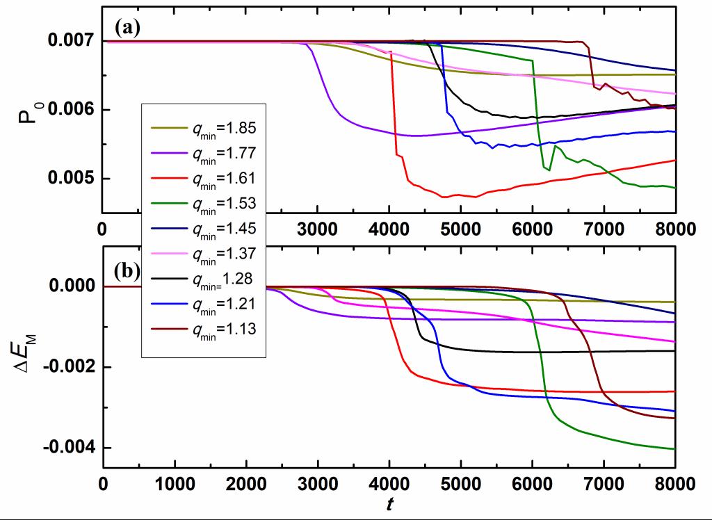 圖1不同安全因子,磁軸等離子體壓強(a)和磁能減少(b)隨時間的演化圖。