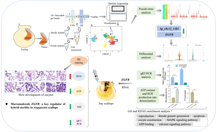 圖1基于單細(xì)胞轉(zhuǎn)錄組技術(shù)發(fā)現(xiàn)的EGFR基因?qū)?em>Argopecten屬雜交扇貝育性的調(diào)控機(jī)制
