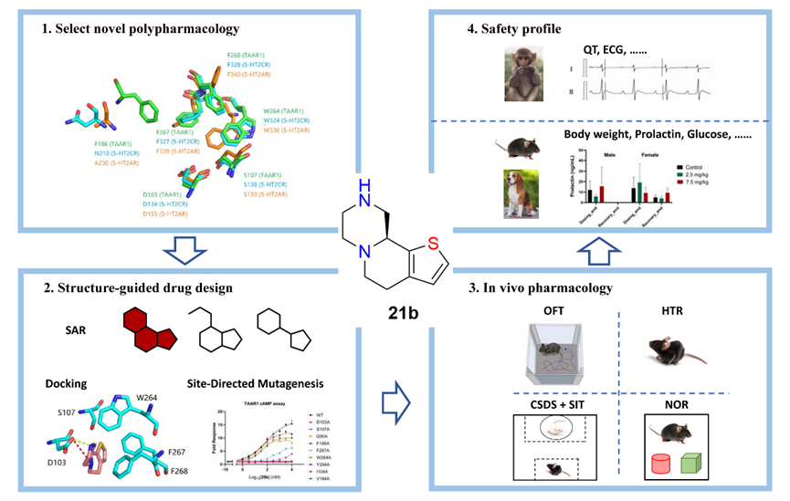 近日,煙臺大學藥學院/分子藥理和藥物評價教育部重點實驗室田京偉/張劍釗/蘆靜團隊與綠葉制藥集團創新研究院,首次發現微量胺相關受體1 (Trace-amine associated receptor 1, TAAR1)和5-HT2C受體(5-hydroxytryptamine receptor 2C, 5-HT2CR)的相似結合模式,用于新一代治療精分藥物/阿爾茨海默病精神病性障礙等疾病研發。蘆靜帶領藥物設計團隊基于人工智能藥物設計和計算機輔助藥物設計(AIDD/CADD)獲得全球首個雙靶點激動劑,表現出對TAAR1和5-HT2CR高特異性的強激動活性,在多種藥效學模型展現出顯著優于目前臨床用藥的特征;已在中國和美國進入臨床I期多劑量遞增(MAD)研究階段,臨床前和初步臨床結果顯示耐受性和安全性良好,未出現抗精分藥物常見的錐體外系不良反應、血脂代謝異常、體重增加等副作用,被行業列為具有“重磅炸彈”潛力的分子。這一重要的科研成果不僅為精神分裂癥和阿爾茨海默病精神病性障礙等患者提供了新的治療選擇,也為未來藥物研發提供了創新策略。