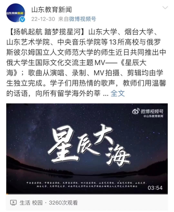 王晨晨,煙臺(tái)大學(xué)音樂舞蹈學(xué)院2018級音樂學(xué)專業(yè)校友,現(xiàn)在就讀于俄羅斯彼爾姆國立人文師范大學(xué)音樂教育專業(yè)。2022年參與錄制中俄文化交流主題MV《星辰大海》。