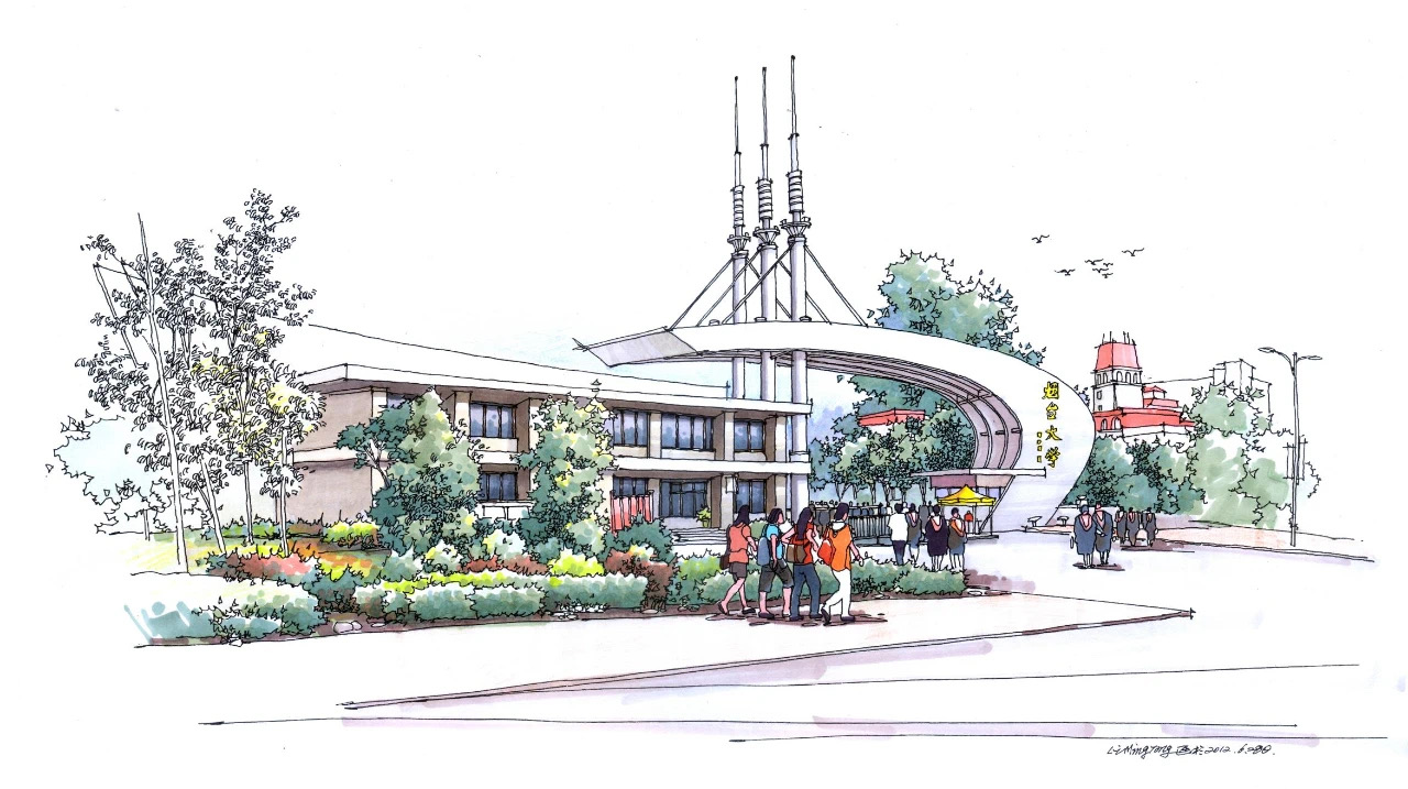 在眾多方案中,年輕的高宏波老師具有濱海建筑特色的設計方案脫穎而出。此方案延續了1990年東門設計的基本思路,并加以新的創意表達。方案將風帆、海浪、桅桿、船,等與大海有關的形象加以抽象變形,轉化為大門的各個構成要素,然后有機地組織在一起:“海浪”和“風帆”相結合,抽象成了一道由地面升起橫跨道路并向上拱起的弧線;“桅桿”轉化為三根高聳的立柱,通過斜拉索在另一端支撐著“弧線”的重量,同時形成周邊區域的制高點;“船”的形象則抽象成一片中間下凹的不規則墻體,與兩層高的公安處辦公室穿插在一起,形成今天我們所看到的新東門形象。橫跨大門上方的那道弓形橫梁,恰似正在由強勁海風鼓起的風帆,給人以力與美、形與勢的想象。它寓意進入新世紀的煙臺大學,猶如一條蓄勢待發、揚帆遠航的大船,踏平萬頃海浪,勇敢駛向一代代煙大人逐夢高水平大學的遠方。