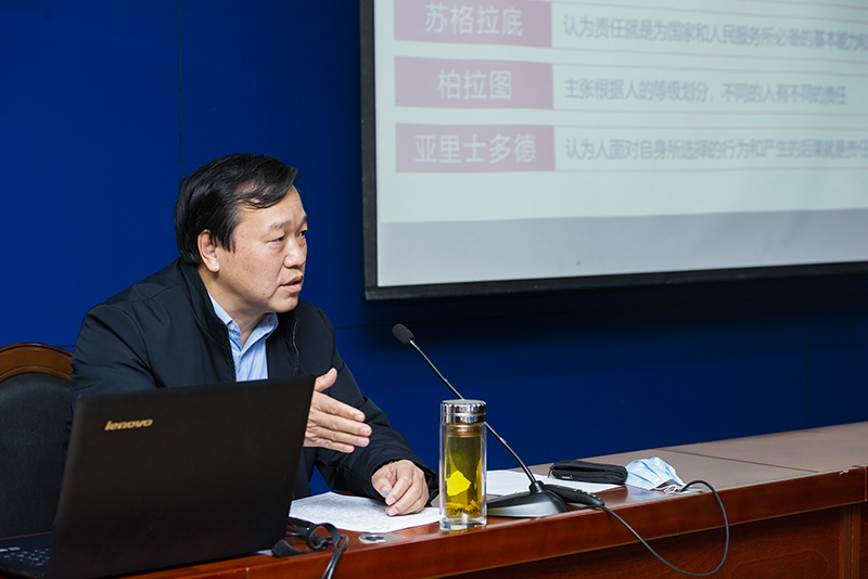 “責任擔當是新時代的關鍵詞,責任貴在擔當”,郭善利給在座學生分享了一個寓言故事,引用名言名句,剖析了責任擔當的內涵,結合我國抗擊新冠肺炎疫情的偉大斗爭,告訴大家擔當責任是一種自信的精神狀態,躊躇滿志、舍我其誰;是一種主動出擊的行為選擇,挺身而出、迎難而上;是一種價值依托,同舟共濟、守望相助。