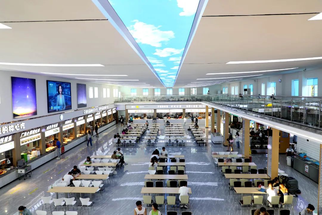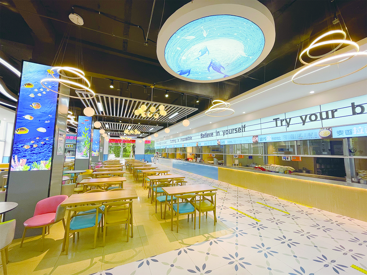 在餐廳裝修方面,三個餐廳分別以白、藍、中性色為餐廳裝修主色調,色彩明媚亮麗。餐廳內新增空調,室內溫度適宜,為師生們帶來更豐富的就餐體驗。后廚全部進行重新改造裝修,每個操作間加裝了甲級防火門,安裝了自動報警裝置,食品安全、消防安全保障全新升級。