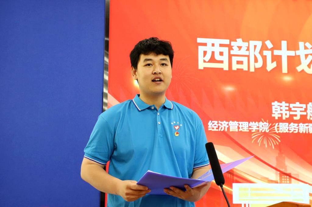 盧國強為2024年西部計劃志愿服務團授旗。姚昌為西部計劃志愿者代表頒發綬帶。經濟管理學院2020級本科生韓宇航、土木工程學院2021級研究生吳玥代表2024年西部計劃志愿者依次發言。志愿者們用沖鋒在前、投身西部的決心,踐行了奉獻祖國、實現自我的青春誓言。
