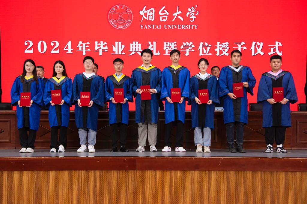 典禮在雄壯的國歌聲中拉開帷幕。黨委常委、副校長王強,黨委副書記白青分別宣讀《煙臺大學關于表彰2024屆優秀畢業生的決定》《煙臺大學2024年關于授予鄒文博等4名同學博士學位、曹藝璇等1168名同學碩士學位的決定》。學校領導為優秀畢業生代表頒獎。