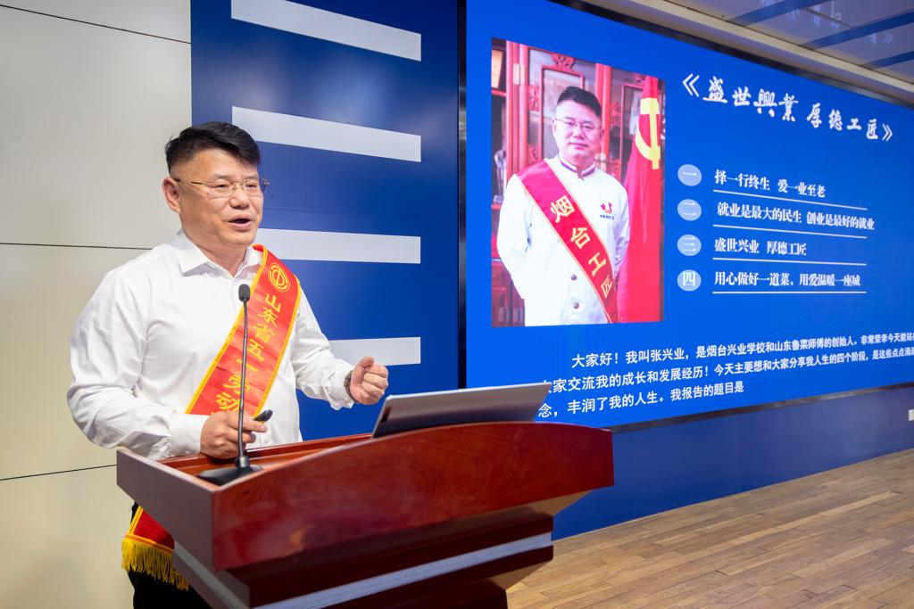 宣講中,崔力元通過回顧煙臺發展歷程中不同時期的勞模事跡,結合自身對勞動精神的理解,指出勞動精神經歷了從“追跑”“并跑”再到“領跑”的時代發展,闡述了“勞動最光榮、勞動最崇高、勞動最偉大、勞動最美麗”的價值內涵。張興業以“盛世興業,厚德工匠”為主題,講述自己“出身草根,拼搏不息”的成長歷程和“孜孜奉獻,感恩前行”的創業故事,展現了自強不息、追求卓越、勇攀高峰的拼搏精神。曹園媛分享了自己扎根海島13年的心路歷程,講述了愛的接力的故事,展現了一位基層工作者在平凡崗位上的堅守,用實際行動詮釋了感恩、熱愛和責任。