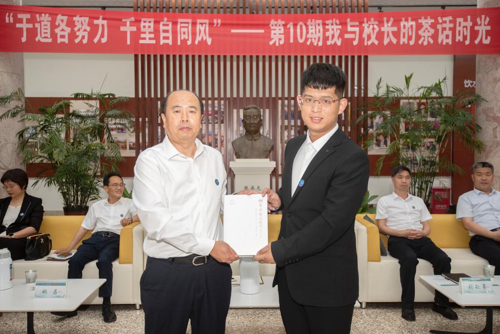 【本站訊】“我來自一個經濟困難家庭,是國家和學校的獎助政策照亮了我的求學之路,讓我相信寒門學子也能綻放光芒”“從四度折戟的論文低谷到文章被SCI一區期刊錄用的曙光初現,是導師的鼓勵點燃了我的堅持,讓我叩開了名校博士研究生之門”……6月11日下午,承先圖書館二樓大廳氣氛溫馨融洽,充滿歡聲笑語,第10期“我與校長的茶話時光”(畢業季專場)活動在此舉行。來自21個學院的本科畢業生和研究生畢業生代表與學校領導圍坐一堂,共話成長歷程,暢談未來理想,為母校發展建言獻策。黨委副書記、校長郝曙光,黨委常委、副校長馮素玲、姚昌、張獻勇、王麗、初磊出席活動并為畢業生送上祝福。活動由馮素玲主持。