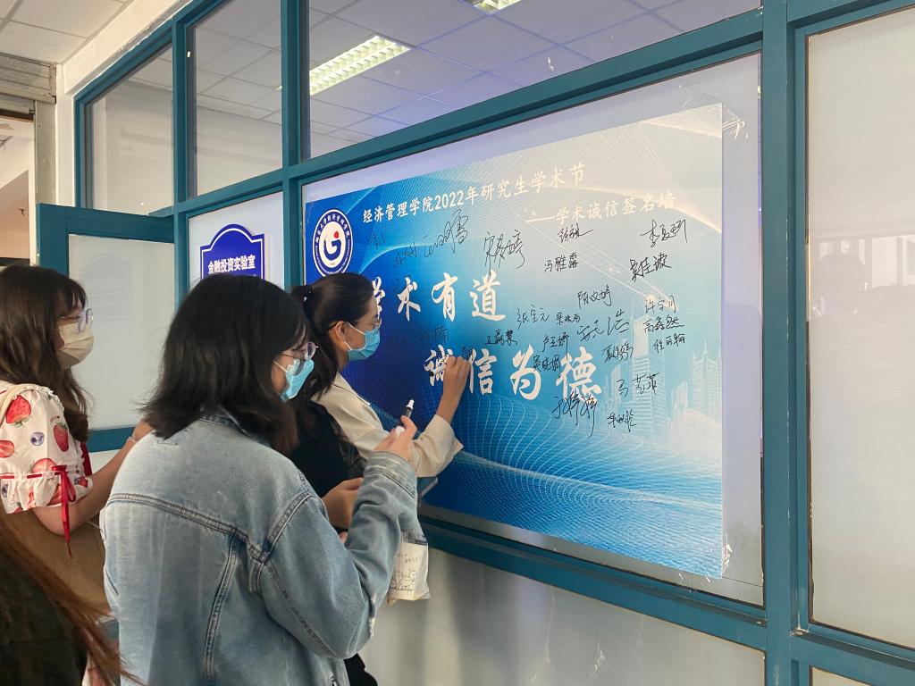 隨后,研究生會學生干部楊蒙山代表經管學院研究生會發起《煙臺大學經濟管理學院研究生學術誠信倡議書》,全體研究生在學術簽名墻和誠信承諾書上簽下自己的名字。活動現場氣氛熱烈,同學們對學術誠信都有著非常強烈的認同感和責任感。他們紛紛表示堅持學術道德,恪守學術誠信應該是研究生同學在科研過程中的必備素養,更是必須堅守的底線。